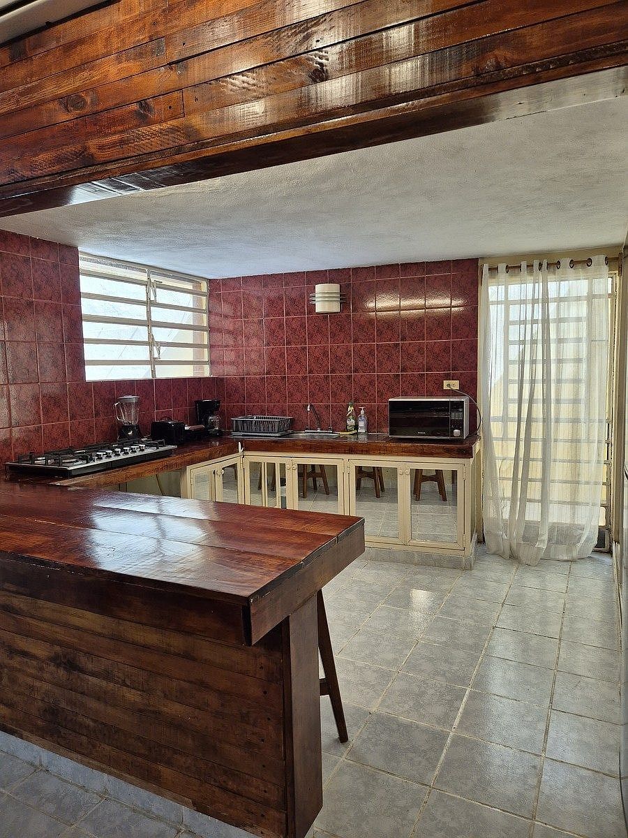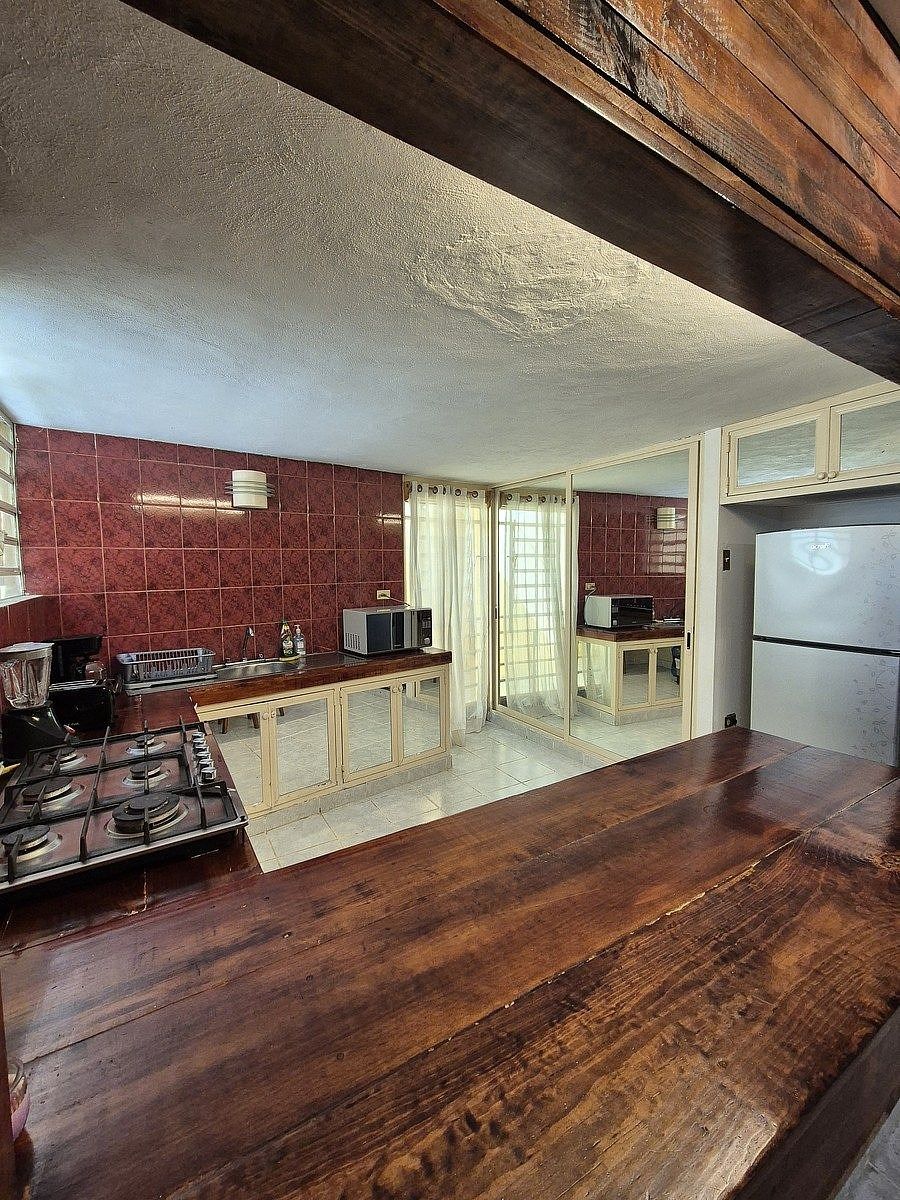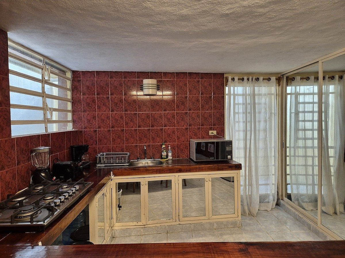 -Cocina vestida con estufa, refrigerador y microondas