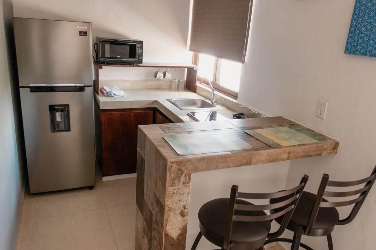 • Cocina equipada con estufa, refrigerador, microondas y barra desayunadora